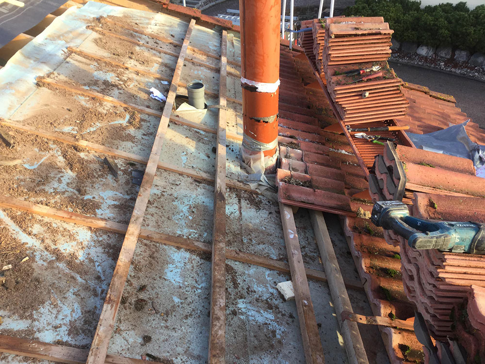 A-Tiilikate tiilikaton uusiminen alkaa vanhan tiilikaton purkamisesta ja kaikkien kattovarusteiden irrottamisesta. Osa kattovarusteista voidaan kunnostaa ja asentaa takaisin, mutta kattotiiliä ei korjailla, vaan ne toimitetaan jäteasemalle.