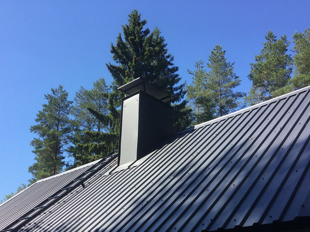 Värivaihtoehtoja on paljon mustasta vihreään, ja kattovarusteita löytyy joka lähtöön. Katolle voidaan asentaa niin lumiesteitä kuin ilmanvaihtoputkia. Kaiken viimeistelee kattopeltisepän toteuttama piipunpellitys, jossa piippu pellitetään ylös asti ja hormin suuaukon suojaksi asennetaan vielä piipunhattu. Kyllä tällaisen katon alla kelpaa saunoa!